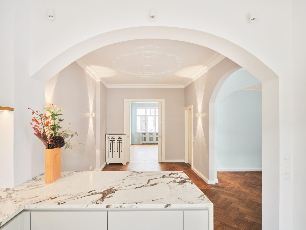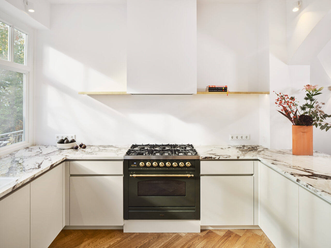 Arbeitsplatte und Tresen in NEOLITH Calacatte, Fronten lackiert , Eingriffnuten